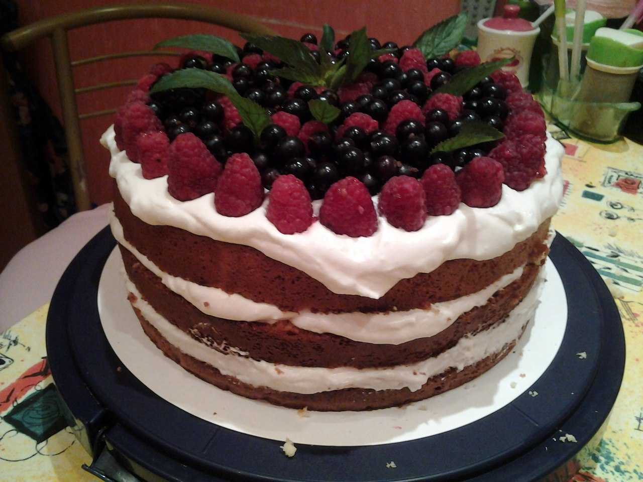 Коржи. Их обильно прослаивают кремовым наполнителем, можно между слоями также добавлять фруктово-ягодные фрагменты. На последний корж, где будет размещаться вся декорация, нанести небольшую кремовую прослойку. Это поможет ягодами держаться плотнее и крепче.