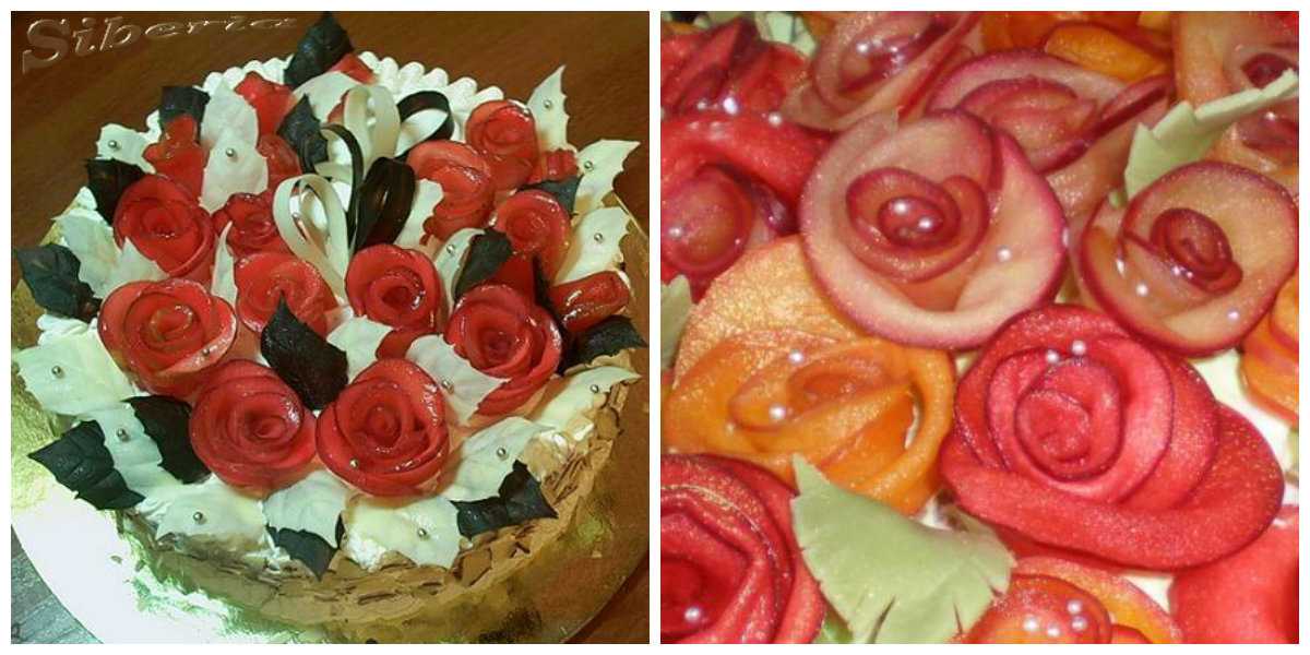 Тем, кто готов к более изощренным способам украшения торта, мы предлагаем освоить розочки из яблок. Конечно, для их создания понадобится наличие свободного времени и сноровки, но, мы уверены, что Вам это будет под силу!
