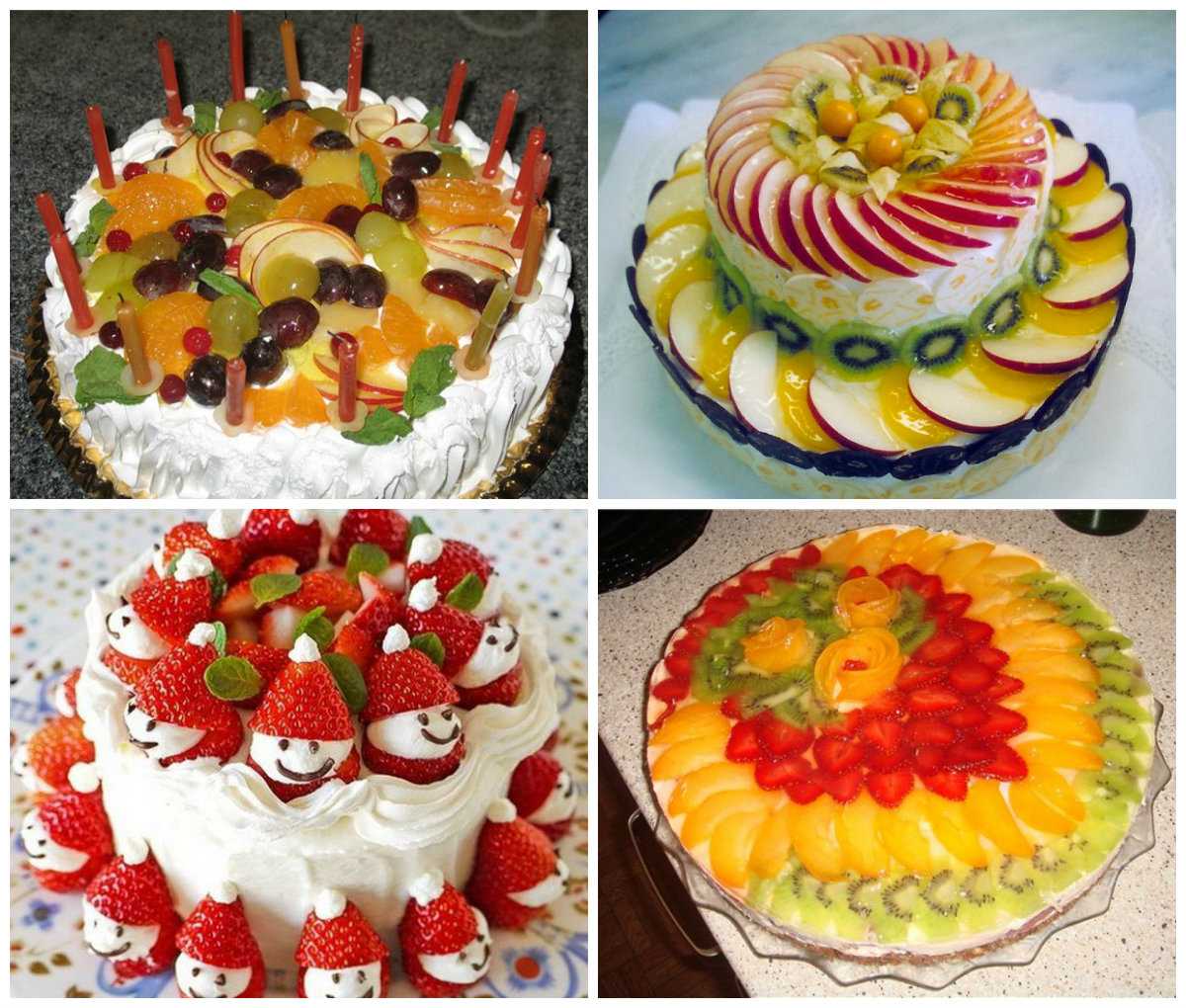 Это правило очень важно выполнять, в противном случае кусочки плодов будут сползать с десерта. Для декора применяются самые разнообразные виды фруктов, в дополнение можно декорировать десерт свежими ягодами, чтобы торт выглядел более красочно