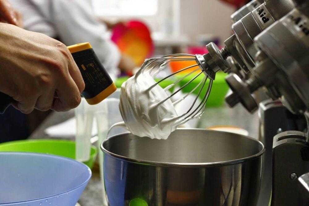 Процесс можно считать завершенным, если смесь держит форму. Соорудите «сугроб» на поверхности, он не должен опадать. Еще один тест на готовность — перевернуть миску с содержимым вверх дном: масса не должна опадать. Если миксер мощный, на взбивание смеси после добавления сиропа уходит 7-10 минут, в стационарном миксере этот процесс проходит еще быстрее.