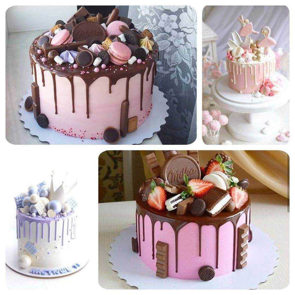 Стильно смотрится сочетание светлых покрытий с темными подтеками. Сверху полностью закрывают поверхность шоколадным декором, печеньем. Укладывают в виде круга, полумесяца, использует рожки для мороженого, чтобы создать эффект высыпающихся сладостей. Украшают торт орео и шоколадками на день рождения, юбилей. Гармонично подобранные украшения смотрится стильно, интересно.