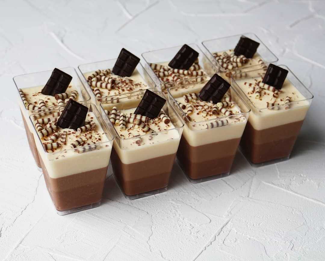 - Взбейте сливки 33 % и добавьте по 100 г в каждую миску с шоколадом. Подготовьте 6 бокалов по 150 мл и влейте в них мусс из темного шоколада, потом поставьте бокалы в холодильник на 15 минут. Влейте в бокалы мусс из молочного шоколада и снова держите в холодильнике 15 минут. Третий слой — из белого шоколада. Теперь бокалы можно оставить на холоде до самого утра или на 6 часов.