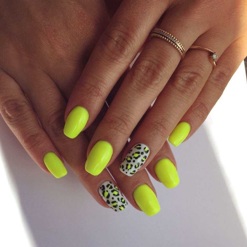 Актуальный зеленый маникюр в сезоне 2018 — это сочетание зеленого и желтого, которое используется во флористических и анималистических дизайнах.